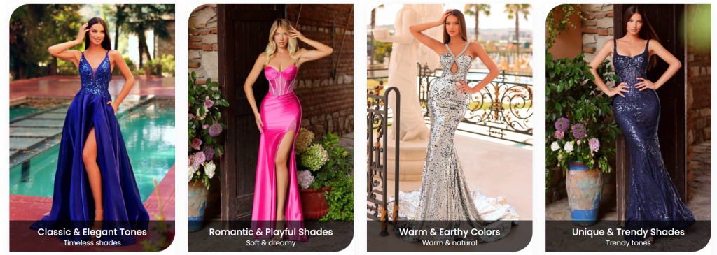 - Prom dresses featuring trendy styles, vibrant colors, and flattering cuts.