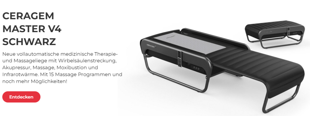 Bei Ceragem findest du ein breites Spektrum an Gesundheits- und Entspannungsangeboten. Herzstück sind die automatisierten Massagebetten, die gezielt auf Wirbelsäule, Muskeln und Gelenke wirken. Ergänzend dazu bietet die Marke ergänzende Anwendungen wie Wärmebehandlungen, Akupressur-Massagen und Programme zur Verbesserung der Durchblutung.