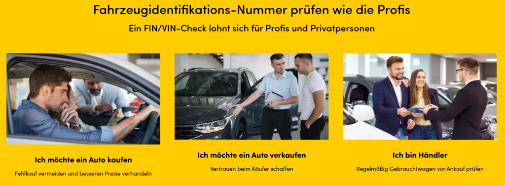 Bei Cardentity gibst du die 17‑stellige Fahrzeugidentifikationsnummer (FIN oder VIN) eines Fahrzeugs in das System ein. Diese Nummer ist weltweit einzigartig und verrät viel über das Auto – darunter Hersteller, Ausstattung, Baujahr und Modell. Auf Basis dieser Nummer erstellt Cardentity einen detaillierten digitalen Report, der verschiedene Daten zur Fahrzeughistorie zusammenstellt. So erhältst du beispielsweise Informationen zu bekannten Schäden, Reparaturen, Serviceeinträgen, Ausstattung sowie eine Marktwert‑Einschätzung, noch bevor du das Fahrzeug bei individuellen Anbietern oder Händlern ansiehst.