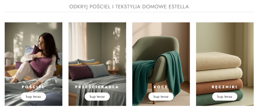 Na stronie Estella można przeglądać pełen katalog produktów, wybierać kolekcje dopasowane do stylu wnętrza oraz sprawdzać dostępne rozmiary i kolory. Strona oferuje również: