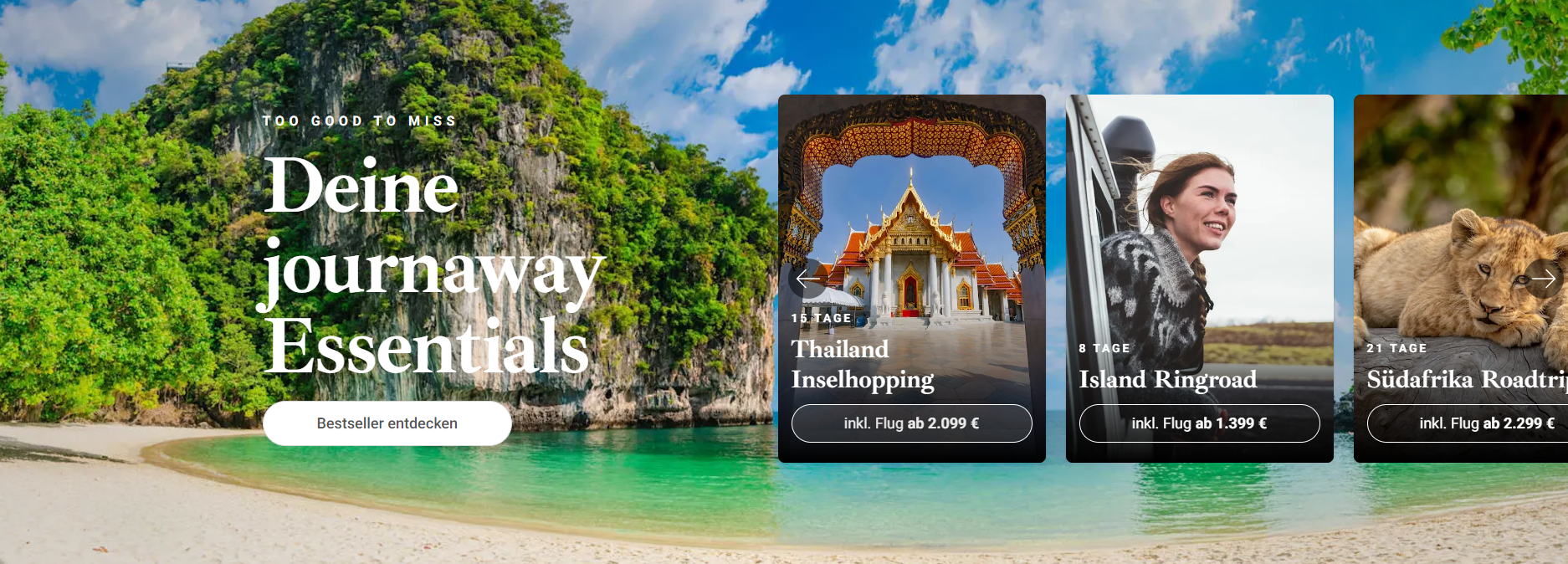 - Vielfältige Reisearten: Egal, ob Sie ein Abenteuer in den Bergen suchen, entspannen möchten, neue Kulturen entdecken wollen oder auf eine romantische Auszeit aus sind – Journaway bietet für jede Art von Reisenden die passenden Angebote.
