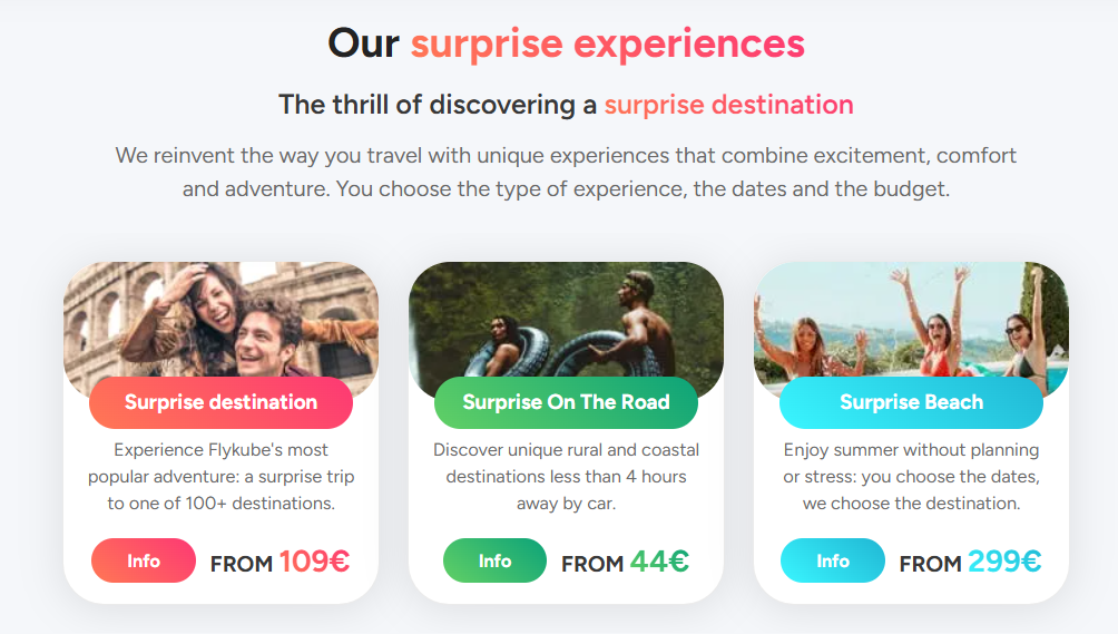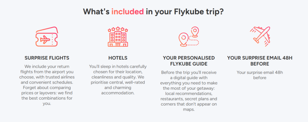 Na stronie Flykube użytkownicy mogą znaleźć oferty tzw. surprise trips — czyli wyjazdów, gdzie szczegóły dotyczące miejsca docelowego zostają ujawnione dopiero na kilka dni przed wylotem. Taka forma podróżowania obejmuje zazwyczaj przelot w obie strony oraz zakwaterowanie w hotelu o standardzie 3★ lub 4★, położonym w centrum miasta.