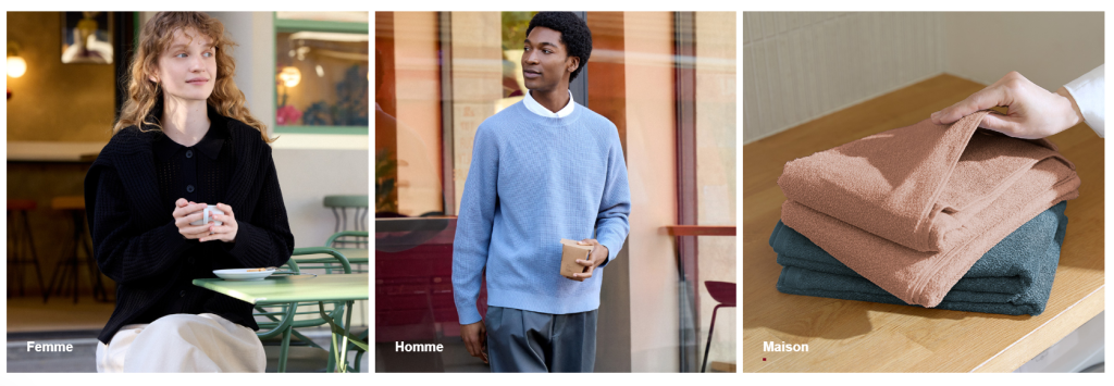 Côté mode, MUJI propose des vêtements pour homme, femme et enfant qui se distinguent par leur confort, leur coupe simple et leur qualité. Les collections incluent souvent des basiques intemporels, comme des t‑shirts, des pulls, des pantalons ou des sous‑vêtements, conçus pour durer et s’intégrer naturellement à une garde‑robe polyvalente.