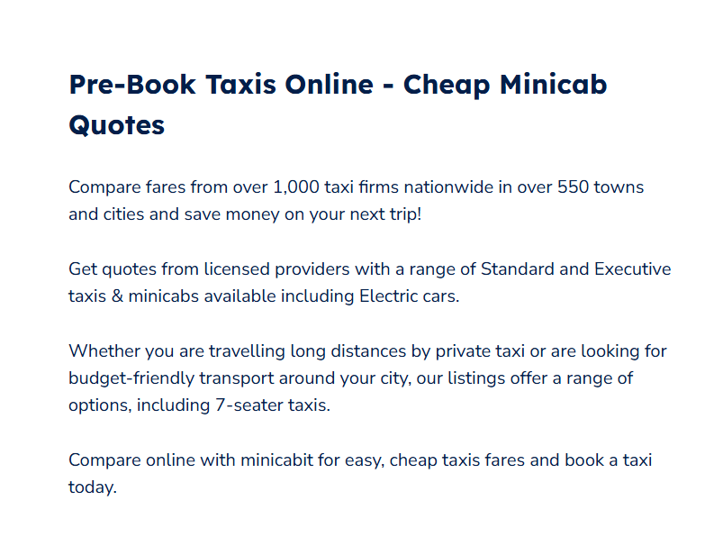 La plateforme offre une variété de services adaptés à tous les voyageurs. Les transferts entre aéroports et villes permettent d’arriver ou de partir sereinement, avec un chauffeur prêt à vous accueillir à l’heure. Les trajets longue distance offrent confort et fiabilité pour vos déplacements interurbains. minicabit propose également des options pour les groupes ou les personnes à mobilité réduite, avec des véhicules adaptés et spacieux. Chaque service est clairement présenté sur le site, et des filtres permettent de choisir facilement le véhicule, le nombre de passagers et les services souhaités.
