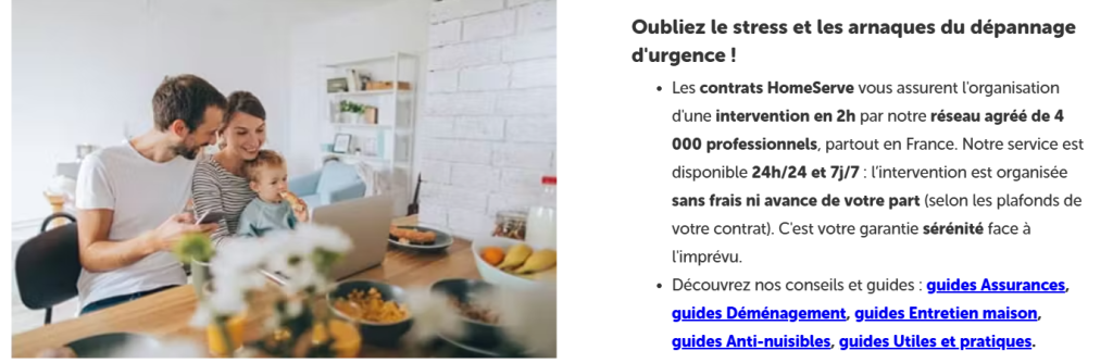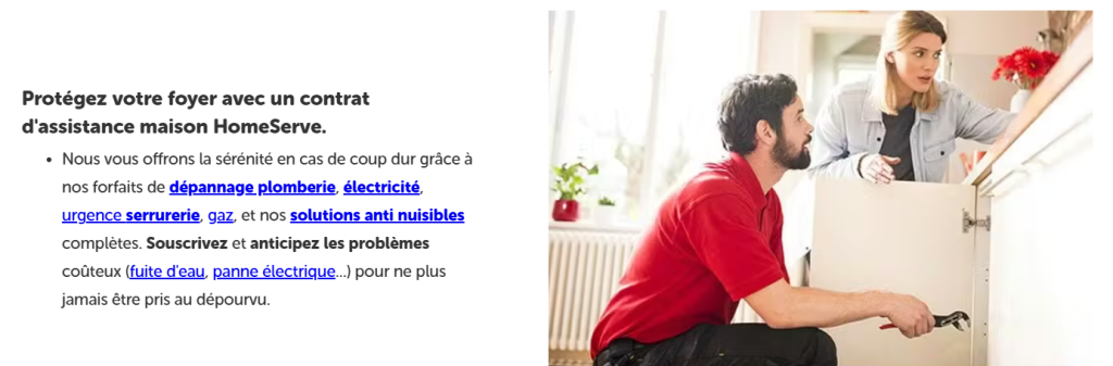 Le site de HomeServe agrège tous les contrats d’assistance proposés, organisés par catégories pour faciliter la navigation et le choix en fonction de vos besoins : plomberie, électricité, gaz, serrurerie, anti‑nuisibles ou encore assistance pour objets connectés. Chaque offre est détaillée avec ses avantages, ses niveaux de couverture et ses modalités pour que l’utilisateur comprenne précisément ce qu’il souscrit.