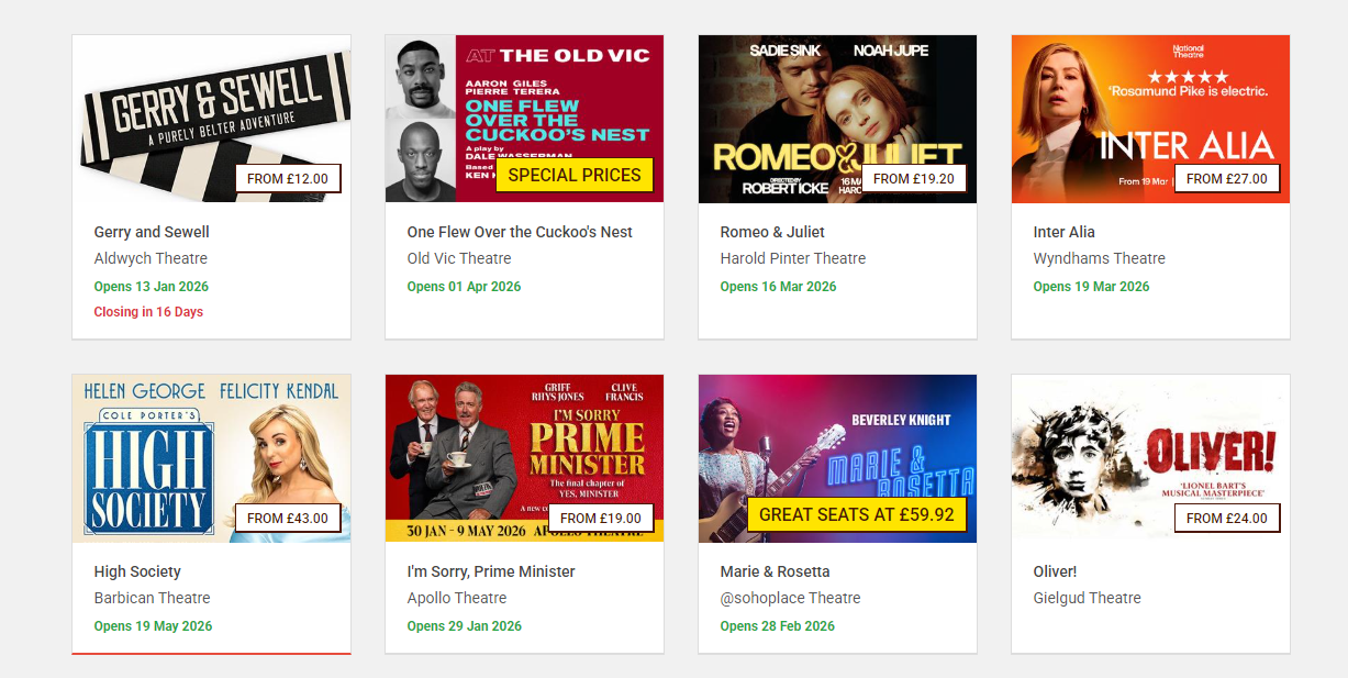 • Musicals, Plays, and Family Shows: Whether you’re a fan of musicals, dramas, comedies, or family-friendly performances, Theatre Tickets Direct has something for everyone. The site features an extensive selection of ticket options, including popular musicals, classic plays, new writing, and shows designed for younger audiences. You’ll find a rich variety of performances, making it easy to choose a show that suits your interests.
