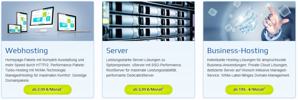 Bei 1Blu finden Nutzer:innen eine breite Palette an Hosting-Lösungen. Das Angebot reicht von klassischen Webhosting-Paketen über Managed-Server, VPS (Virtual Private Server) bis hin zu speziellen Cloud-Lösungen. So können kleine Webseiten, Blogs oder umfangreiche Unternehmensprojekte gleichermaßen optimal betreut werden.